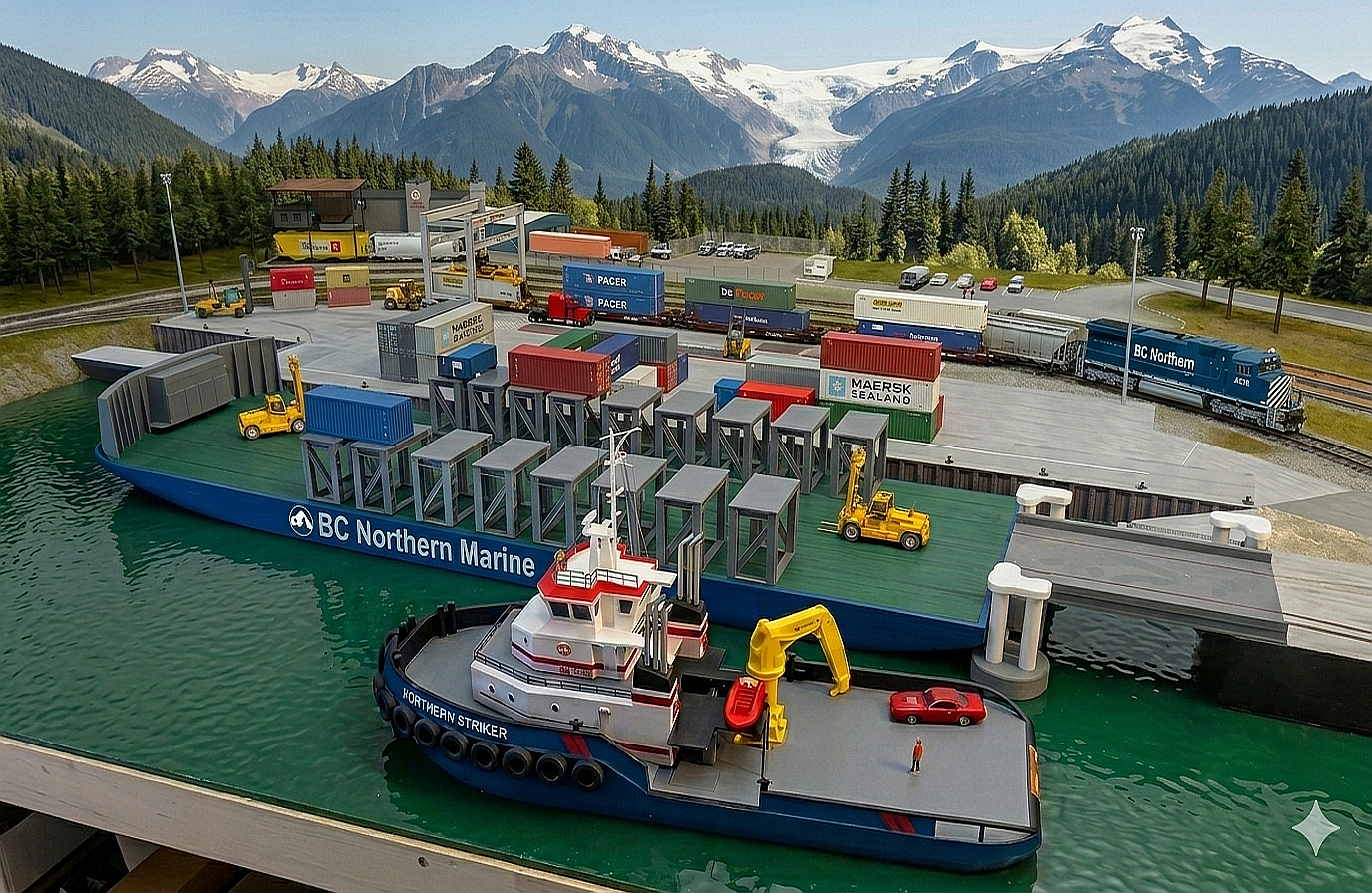 The current state of the barge or car float hasn’t changed much. The main reason I built the preliminary hull was to help with the track laying for the barge slip, to gauge space requirements, track heights and such. So this photo is a little bit older, but it captures, how the custom 3d object I put into Trains (above) translates into the actual model.