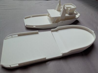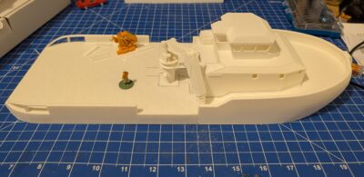 I started work on the Shoalbuster which is planned to become a fair representation of the Damen Shoalbuster 3612, which is so far the largest Shoalbuster at 36 by 12 meters dimensions, which translates into a waterline hull of just about 40cm in length (15,75in). Well, technically the Damen Shoalbuster 3514 is quite a bit bigger (it’s 1m shorter, but 2m wider and has four (4!) Kort Nozzle drives), but it’s shorter, so it lies in the perspective of the reader.