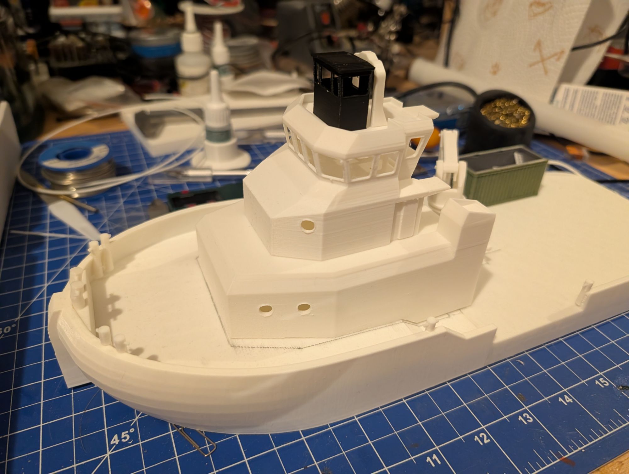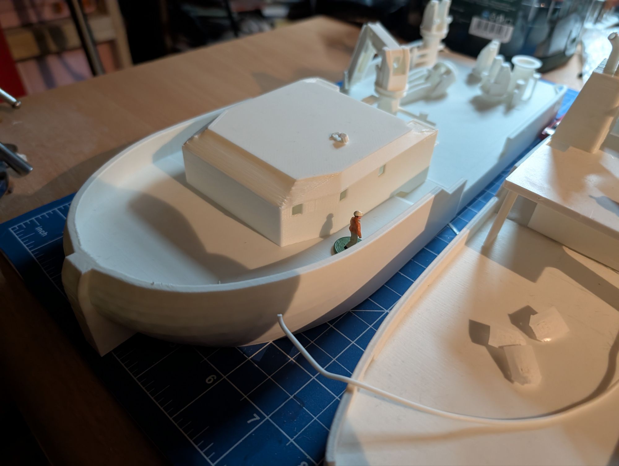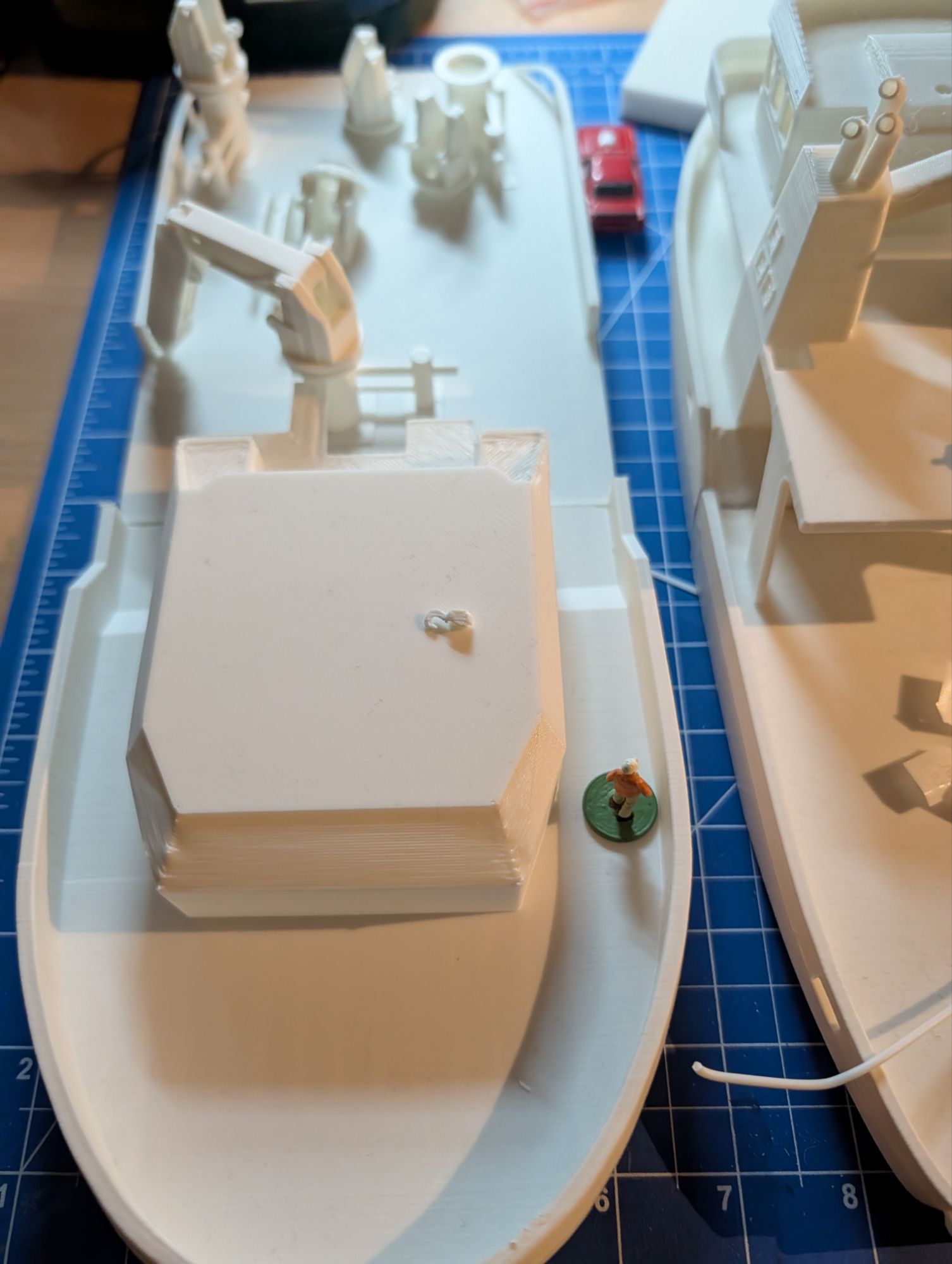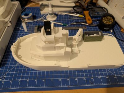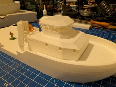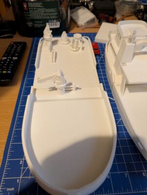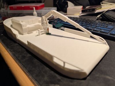 The changes to my model primarily relate to the superstructure which is now more visually appealing, but also more challenging to model. THe following gallery shows the 3D printed parts of the model as it currently sits on my workbench.