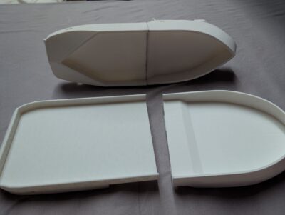 I printed the basic hull pieces out overnight – that was 15 hours each, but I have 2 printers, so that was 15 in total – and here is a first glimpse.