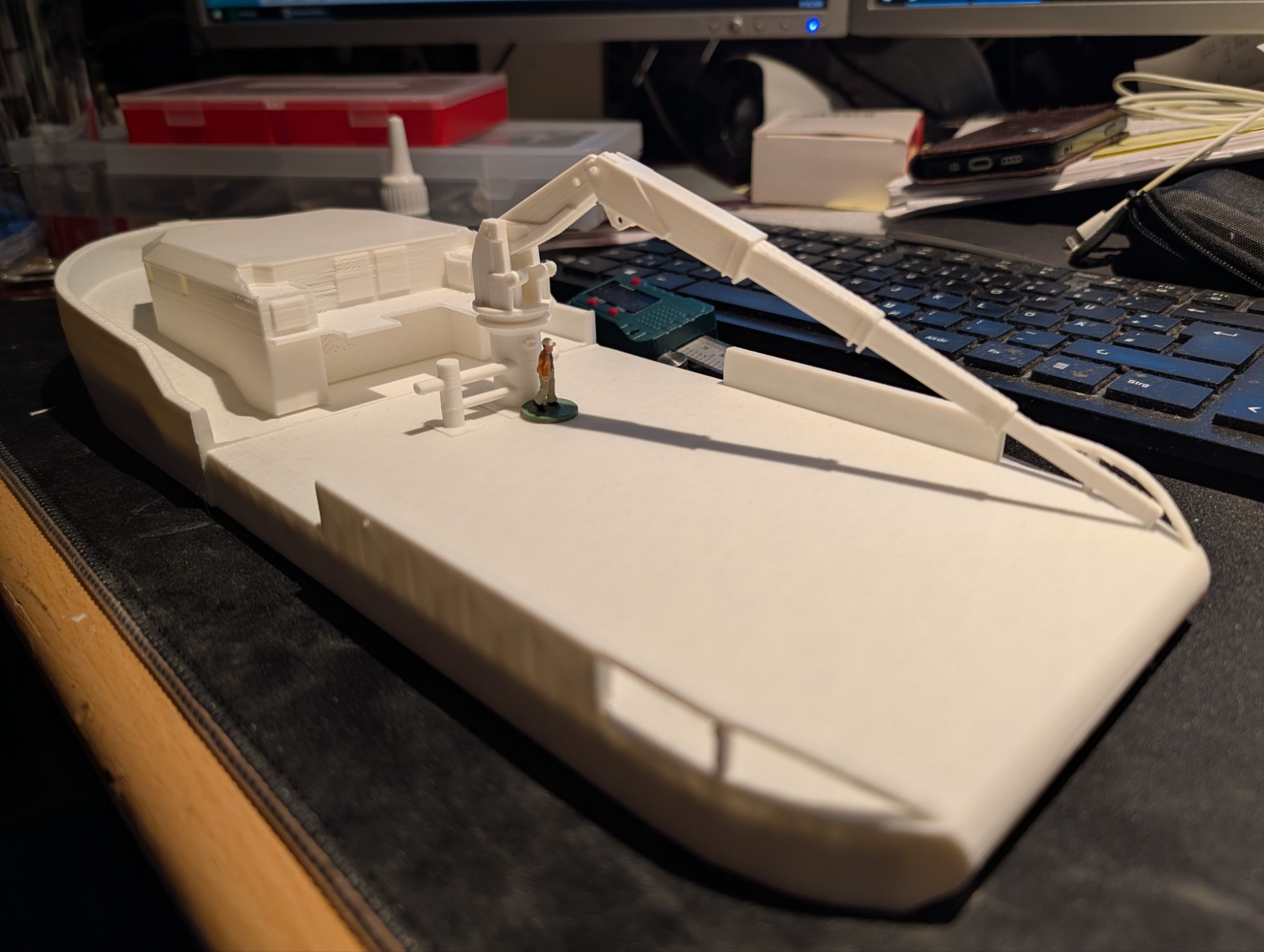 I consider this the perfect size for a ship in HO scale that isn’t meant to dwarf the layout itself. Just imagine a 100cm (3ft 3,37in) AHTS next to a barge of the same size on a layout section barely twice the size. And further imagine all this on the front side of the layout. It would completely block the view, dwarf the layout and overwhelm the viewer’s focus for it’s massive presence. Not stating the modelling feat itself. So the comparatively small Shoalbuster is the ideal vessel for my pike.